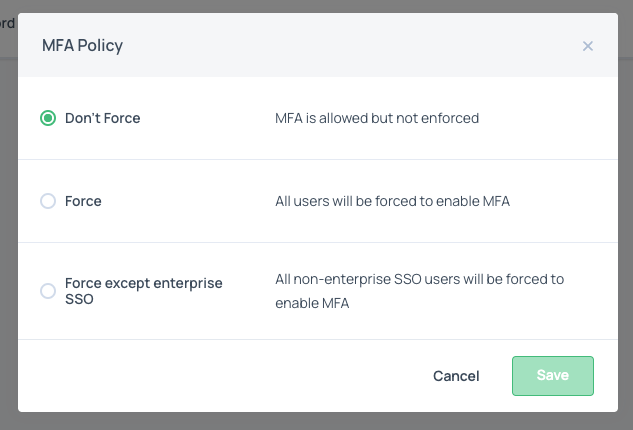 MFA can be enabled or disabled from the Settings menu by anyone with Admin access.