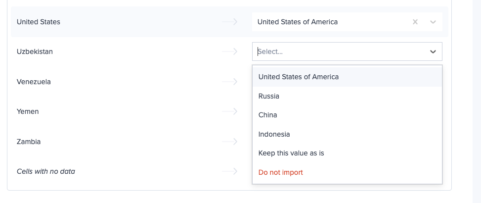 If the correct value is not present, you have two additional options to choose from: "Keep this value as is" or "Do not import". "Keep this value as is" will import that value into the option field wherever it is listed in your file. Please note that if it is not one of the pre-defined values in the option field, it will display with an error in the review table. "Do not import" will keep that one value from being imported (not the whole column!) and instead will display a blank space in the corresponding cell in the review table.