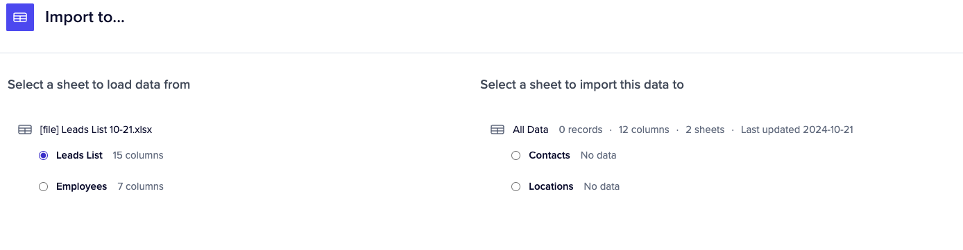 When starting the mapping process, if you're uploading a file with multiple sheets, you will see a screen that will allow you to choose which of the sheets to map to the destination sheet. If you are initializing the import from a "Files" tab, you'll also be able to choose which sheet to import data to. If you are importing directly to a sheet, this will be auto-selected for you.