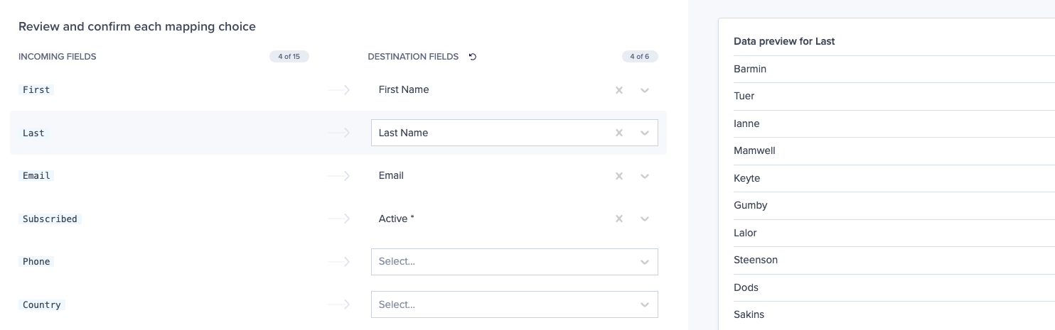 Once the relevant information here has been selected, you'll be brought to our Map Fields page. You should see most or all of your incoming fields automatically mapped to a destination field.