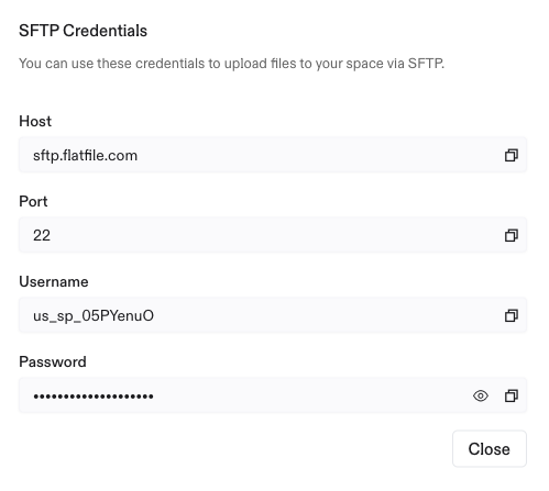 There will be one set of credentials per space; a user with access to their space's credentials will not be able to access or import data to a different space. Uploads are one-way for security purposes; once a file is uploaded, Flatfile extracts it and then removes it from the SFTP server.